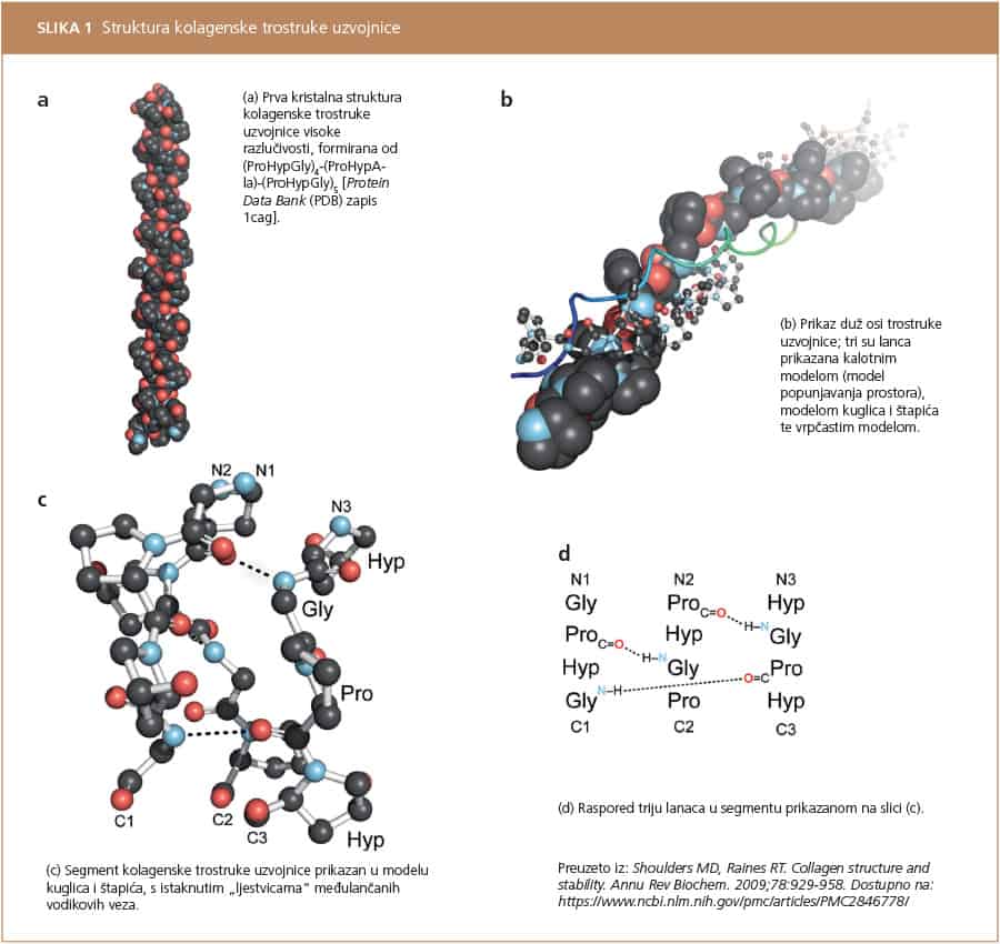 Kolagen je najzastupljeniji protein u ljudskom organizmu te čini približno 30% ukupne proteinske mase. Riječ je o fibrilarnom strukturnom proteinu čija je osnovna građevna jedinica tropokolagen – molekula sastavljena od tri polipeptidna lanca omotana u karakterističnu desnu trostruku uzvojnicu (heliks). Svaki lanac ima specifičnu aminokiselinsku sekvencu s ponavljajućim tripletima u kojima glicin zauzima svaku treću poziciju (Gly–X–Y) dok su na pozicijama X i Y najčešće prisutni prolin i hidroksiprolin (Slika 1).